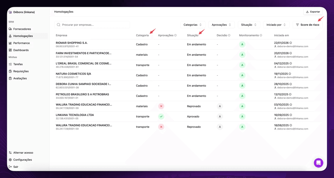 Assim, informações como Categoria, Score e Situação da homologação estão na aba de Homologações: