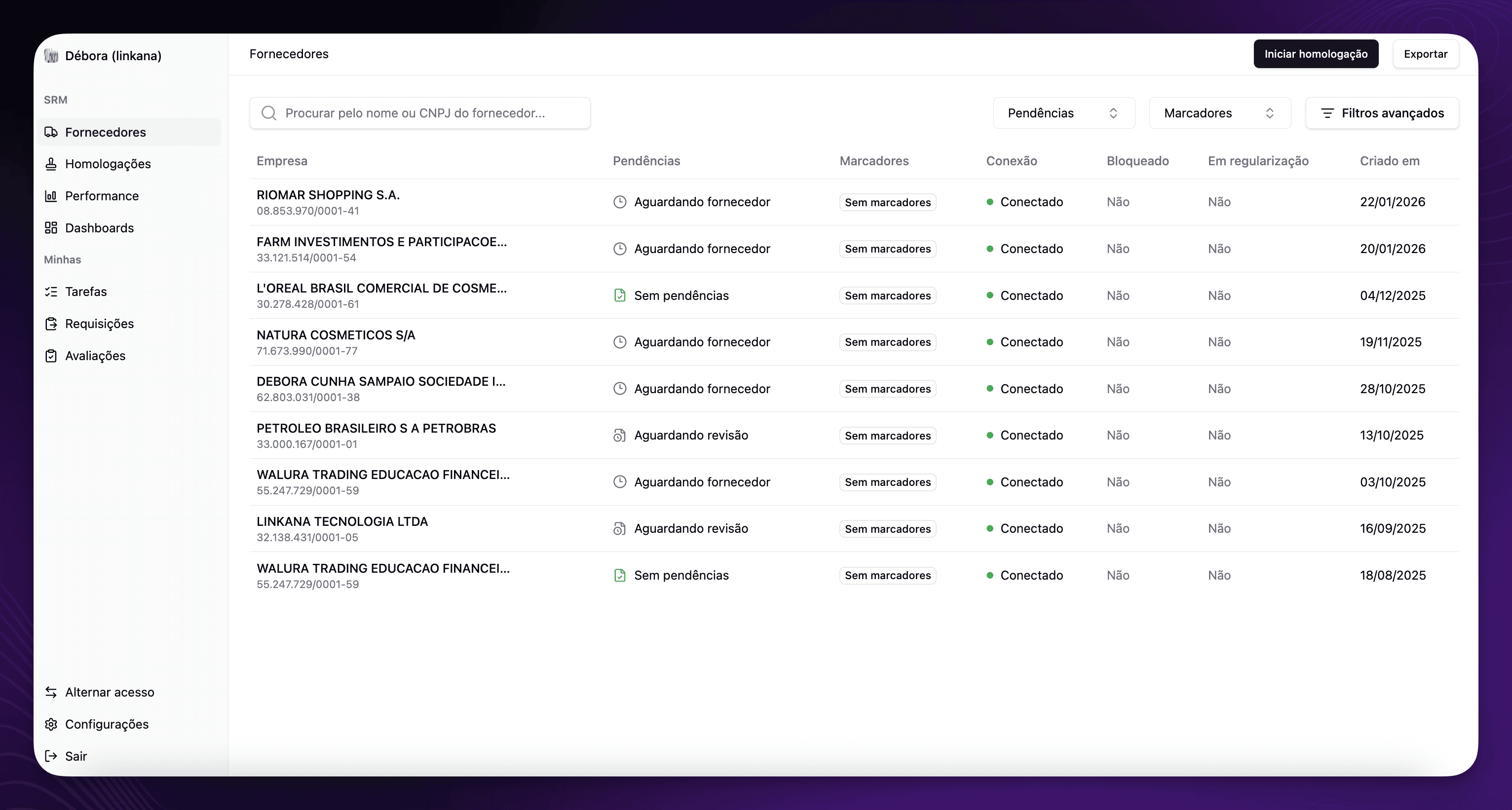 Fornecedores: para gerenciar marcadores, situação de documentos, bloqueios e conexões