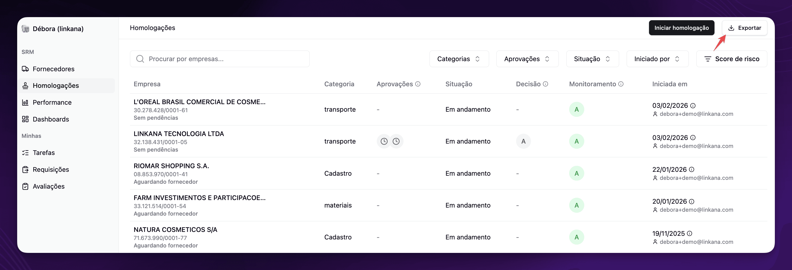 Removemos o botão "Exportar" da listagem de Fornecedores para eliminar redundâncias, já que o mesmo botão está disponível na listagem de Homologações.