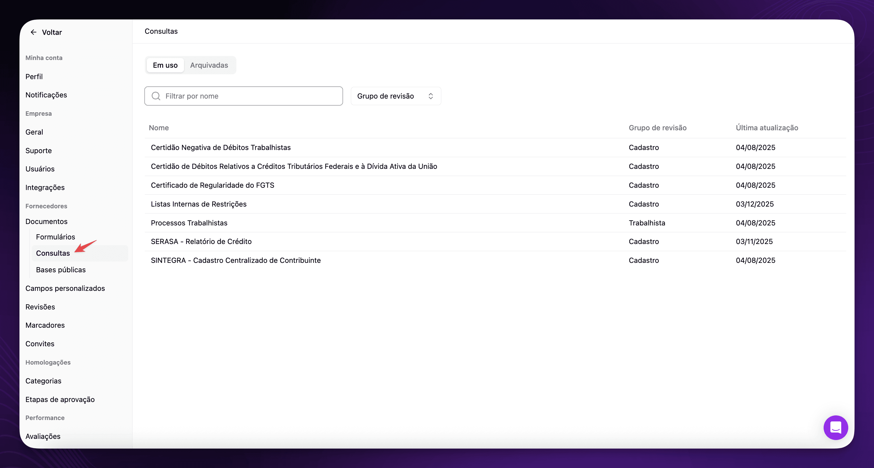 Agora todo fornecedor por padrão nasce ativo. Isso significa que todas as suas informações são atualizadas em tempo real de acordo com sua data de validade, desde dados da base da receita, listas restritivas a certidões.